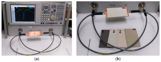 Prototypes of the four permittivity sensors described in the previous section were fabricated on an RF-35 substrate (εr = 3.5, tan δ = 0.0018, h = 0.76 mm), as shown in Figure 8. The S-parameter characteristics of the fabricated sensors were measured using an Agilent N5230A network analyzer, and a photograph of the experimental setup is shown in Figure 9. Five different standard dielectric MUTs from Taconic were tested for the sensitivity comparison. The MUTs had permittivity values ranging from 2.17 to 10.2, and their permittivity, loss tangent, and thickness from the data sheet [33] are summarized in Table 2.