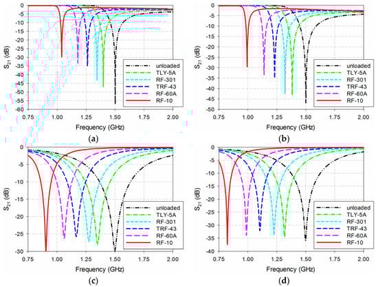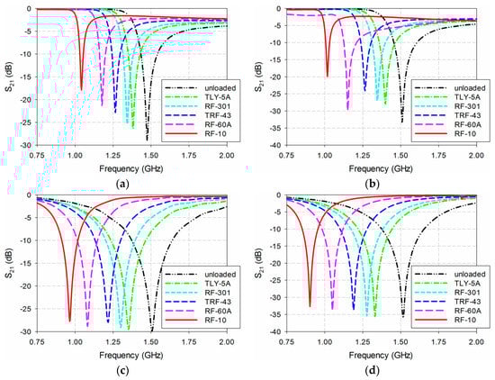 Figure 10. Simulated S21 characteristics of the four permittivity sensors for MUTs in Table 2: (a) DR-CSRR; (b) SR-CSRR; (c) R-SR-CSRR; (d) proposed IDCS-DGS.