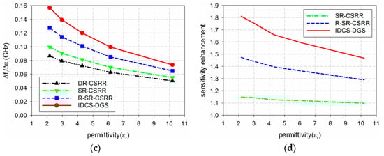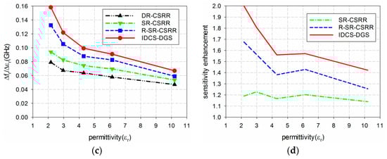 The sensitivity of the four permittivity sensors was analyzed from the results shown in Figure 6 and Table 1. The shift in the resonant frequency (Δfr = fr_unloaded − fr_loaded) of S21 is plotted in Figure 7a. Figure 7b shows the percent relative frequency shift (Δfr/fr_unloaded(%)) of the four permittivity sensors. Next, the sensitivity of the sensors was defined as the ratio of the resonant frequency change to the permittivity change (S = Δfr/Δεr = |(fr_unloaded − fr_loaded)|/|(εr_unloaded − εr_loaded)|) [32], and is plotted in Figure 7c. Figure 7d presents the sensitivity enhancement of the SR-CSRR, R-SR-CSRR, and proposed IDCS-DGS-based sensors compared to the DR-CSRR-based sensor, which is the ratio of the sensitivity of the SR-CSRR, R-SR-CSRR, and proposed IDCS-DGS-based sensors to that of the DR-CSRR-based sensor (S_SR-CSRR,R-SR-CSRR,IDCS-DGS/S_DR-CSRR). When the MUT was loaded below the ground plane, it affected the total capacitance related to the resonators etched on the ground plane and the S21 resonant frequency was a nonlinear function of the resonator related capacitance [20]. It was observed that the sensitivity was not constant as a function of the permittivity, and it became higher for the smaller value of the permittivity. In other words, the sensitivity of the sensors decreased monotonically when the permittivity increased.