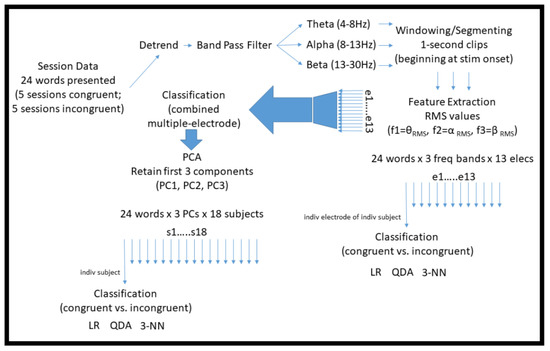 Since each experimental session was homogenous (i.e., contained either all congruent or all incongruent words), to minimize potential confounds associated with adaptation or fatigue across sessions, five separate training datasets were formed by combining ordinally corresponding pairs of congruent and incongruent sessions. An individual classifier was learned for each subject–electrode–session pair combination. Generalization performance was assessed using leave-one-out cross-validation (LOOCV) [31], and summarized for each subject–electrode by taking the median accuracy over the five pairs of sessions. (To be concise, hereafter when discussing the initial analysis methodology described in Section 2.2.1, Section 2.2.2, Section 2.2.3, Section 2.2.4, Section 2.2.5 and Section 2.2.6, we refer to this median accuracy simply as the “performance” or “accuracy” of the classifier.) Inside the cross-validation loop, training features were normalized by subtracting the mean and dividing by the standard deviation of each feature. Test points were accordingly transformed using the training mean and standard deviation. Figure 3 summarizes the main computational techniques used to process the data in this initial analysis methodology.