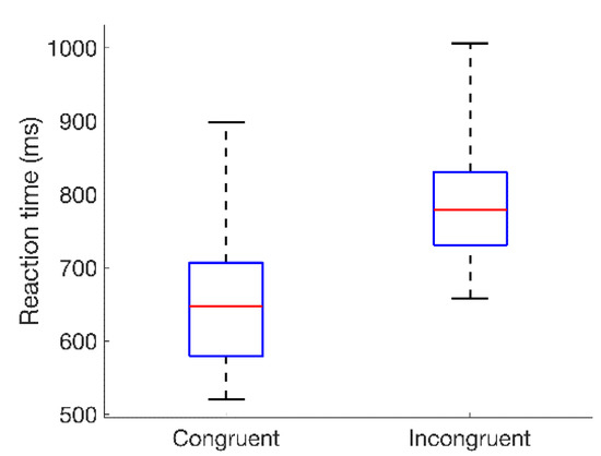 The distributions of reaction times (RTs) for all 18 subjects are summarized for the congruent and incongruent conditions in Figure 4. A Wilcoxon signed-rank test [32] showed a statistically significant difference in the distributions of reaction times across subjects for the congruent and incongruent conditions (p < 0.001). This is consistent with the incongruent Stroop condition increasing cognitive stress, and in agreement with prior research [1].
