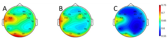Topographical plots of classification performance averaged across all 18 subjects for the: (A) logistic regression; (B) quadratic discriminant analysis; and (C) three-nearest neighbor classifiers. Values represented by the color maps are the proportion of correctly labeled examples. Values at non-electrode locations were obtained via biharmonic spline interpolation [33]. The electrode labeling convention follows the Modified Combinatorial 10–20 Standard [24].