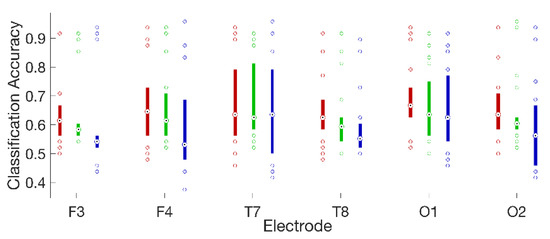 Box plots summarizing the distributions of classification accuracies across all 18 subjects for the logistic regression (red); quadratic discriminant analysis (green); and three-nearest neighbor classifiers (blue), on three laterally symmetric pairs of frontal (F3 and F4), temporal (T7 and T8), and occipital (O1 and O2) electrodes. Medians are shown as black dots inside colored circles and boxes span the interquartile range. Values falling outside the interquartile range are plotted as unfilled circles to explicitly show the number of subjects at the extremes of each distribution.