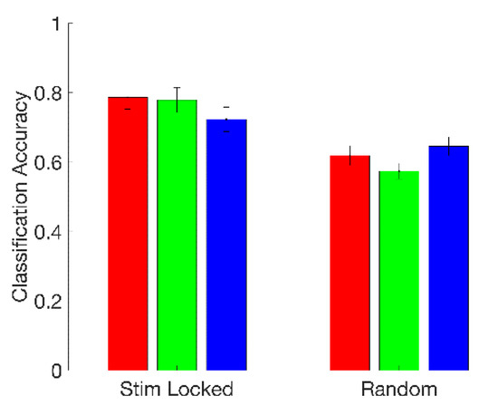 Fused-feature classification mean accuracy across subjects for logistic regression (red), quadratic discriminant analysis (green), and 3-NN (blue), when 1-s feature extraction windows were triggered by the onset of the color–word stimulus (“Stim Locked”) and when 1-s feature extraction windows were taken at random times (“Random”). Error bars are two standard errors in length.