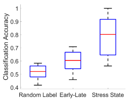 Summary of representative fused-feature classification results. Boxplots show the distribution of classifier accuracies across all 18 subjects for a chance logistic regression classifier formed by randomly permuting the congruent and incongruent labels (“Random Label”); a null logistic regression classifier formed by training to discriminate early versus late segments in congruent experimental sessions (“Early-Late”); and the actual logistic regression stress-state classifier trained to discriminate congruent from incongruent segments (“Stress State”).