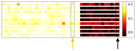 First principal component loadings. Visualization of the average first principal component loadings for nine randomly selected subjects (one subject per row). Each row consists of 39 colored panels, one for each of the 39 electrode–RMS feature combinations used for classification. The panels are colored in proportion to the contribution of their corresponding feature to the first principal component; they are ordered in three blocks of 13 corresponding to the 13 analyzed electrodes, with the leftmost block representing the theta RMS feature, the middle block representing the alpha RMS feature, and the rightmost block representing the beta RMS feature. Within each block, the electrode ordering is as follows: F7, F3, Fc5, T7, P7, O1, O2, P8, T8, Fc6, F4, F8, and Af4. For example, the leftmost panel in all rows represents θ RMS on electrode F7 and the rightmost panel β RMS on Af4. Lighter color panels indicate electrode–RMS feature combinations with stronger positive weightings. The orange arrow indicates one particular combination that has relatively high-magnitude weight across subjects; the black arrow indicates one with relatively low-magnitude weight.