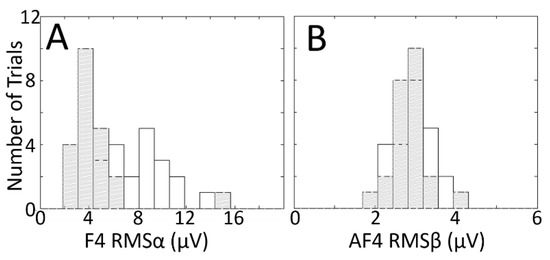 Histograms for these two combinations, shown in Figure 10, further illustrate the point. In Figure 10A, the histograms for the congruent (grey hatched) and incongruent (white) conditions show separation, supporting the utility of the F4–RMSα combination for classification; in Figure 10B, the histograms are overlapping, suggesting that the Af4–RMSβ is a poor combination for discerning the two classes.