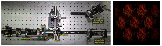- Prevedel, R.; Yoon, Y.G.; Hoffmann, M.; Pak, N.; Wetzstein, G.; Kato, S.; Schrödel, T.; Raskar, R.; Zimmer, M.; Boyden, E.S.; et al. Simultaneous whole-animal 3D imaging of neuronal activity using light-field microscopy. Nat. Methods 2014, 11, 727–730. [Google Scholar] [CrossRef] [PubMed]