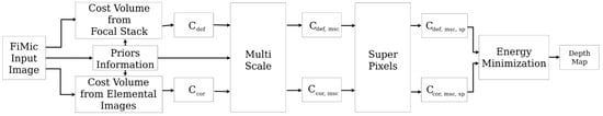 where the weights are defined in Equation (8) and , , indicates respectively the joint variance, the variance of the first and of the second image. The cost volume is built by stacking the difference images calculated for each focal plane. The cost volume is also filtered using a guided filter as in [38].