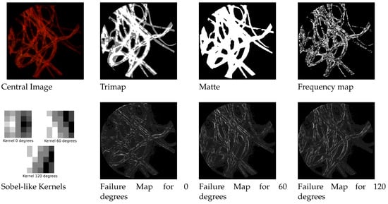 We built three different sobel-like kernel filters to detect edges at respectively and 120 degrees along the three epipolar lines of the hexagonal grid structures. By convolving the image with such a filter we obtain another weight map that favours the contribution of the estimation coming from the most appropriate direction. In Figure 4 it is possible to see the three kernels and an example of failure maps.