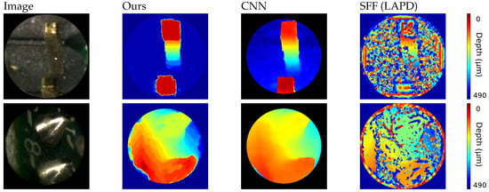 Results on these images lead to some considerations: because of the size of the image, the luminance condition and the reflectance of the metal, the depth map calculations are highly challenging, as proven from results of the shape from focus method [48], that recovers only a very noisy reconstruction. Nevertheless, more sophisticated approaches that incorporate filtering steps, as [49], are able to reach satisfying results, obtaining comparable outcomes.