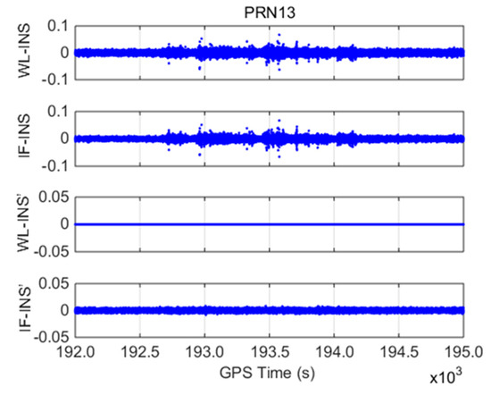 With PRN 13 as an example, INS-aided models, including WL-INS model , IF-INS model , INS error-free WL-INS model , and INS error-free IF-INS model , are shown in Figure 4.