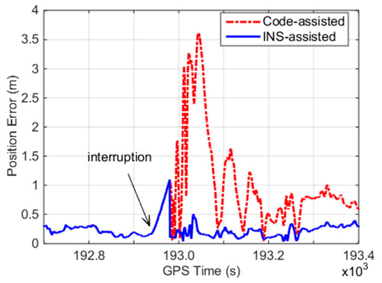 For the outage of 60 s, we obtain the real cycle slips from the float solution of the INS error-free method. These cycle slips are then combined with the ambiguities before the interruption as the initial ambiguities for PPP re-convergence. The positioning error of the INS error-free models is calculated with the reference of differential GPS solution. In addition, code-assisted ambiguity recovery is applied to the data for comparison, as depicted in Figure 6. The INS error-free models decrease the positioning error and accelerate the re-convergence time of PPP compared with the code-assisted method. Although a pair of incorrect cycle slips by the INS error-free method exists, it only causes 0.1–0.2 m ambiguity range errors in the corresponding satellite, which are much smaller than those caused by the code-assisted method.
