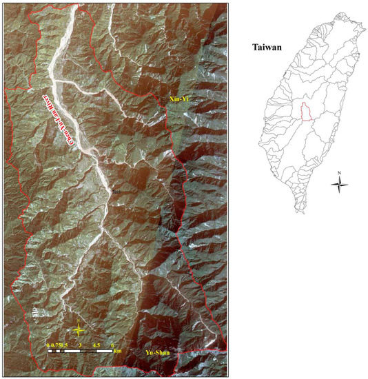 The Chenyulan river watershed is located in the central part of Taiwan, in the island’s major fault zone (slate belt) (Figure 1). This river is a tributary of the Zhoushui river. There are important fault systems in this area, such as Chenyulan, Dili, Kuling Chiao, Shenmu, and so on. The average elevation is 1680 m above sea level, and the average slope is 34.5°. The erosion activities here are complex, and occur at high densities. The area of landslides is 16,598,445 m2, or 4.2% of the total of 392,444,312 m2 in Taiwan. This area is also affected by the tropical monsoon climate of Taiwan, which is warm and humid all year. The rainy season is from May to October, and typhoons often occur in the summer and autumn, from June to October, more frequently in August and September, with on average four direct hits per year [31]. The annual precipitation is more than 2500 mm. The rainfall in Taiwan often concentrates in mountainous areas, and therefore the Chen-Yu-Lan river watershed is also one of the areas with the highest rainfall in Taiwan. Summer rainfall accounts for around 80% of the annual precipitation.