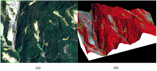 Detecting landslides from Formosat-2 satellite images by ELSADS: (a) 2D true-color composite image; and (b) Standard false-color composite image overlaid on the corresponding DEM.