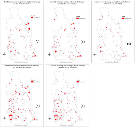 Types of LMs related to typhoons: (a) the pre-event Typhoon Kalmaegi LM, (b) the post-event Typhoon Kalmaegi LM, and (c) the during-event Typhoon Kalmaegi LM, (d) the post-event Typhoon Morakot LM, and (e) the during-event Typhoon Morakot LM.