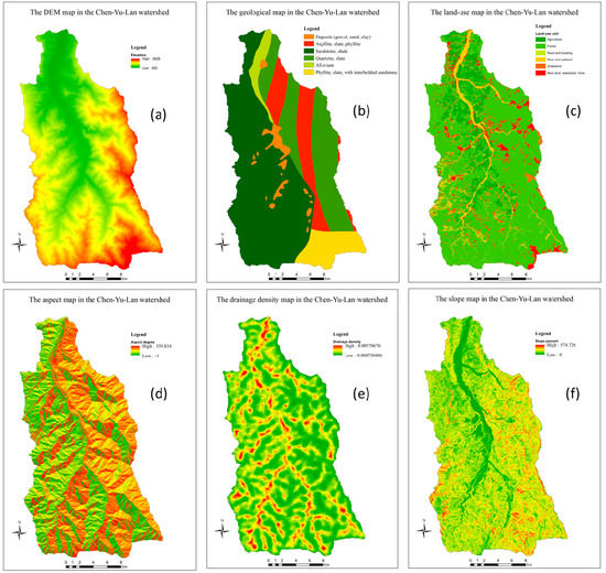 The material maps in the Chen-Yu-Lan watershed: (a) the DEM map; (b) the geological map; (c) the land-use map; (d) the aspect map; (e) the drainage density map; (f) the slope map.