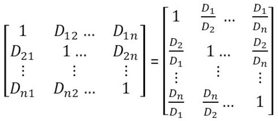 Then, this comparison is made between pairs of indicators (classes) and is combined into a matrix of n lines and n columns (n is the number of indicators or classes in each factor) (Figure 6). The element Dij represents the important level of the index i (line) versus the index j (column). The relative importance of indicator i versus j is calculated in Di/Dj ratio, and vice versa of indicator j versus i is Dj/Di, and Dii = 1 (Figure 6). Each matrix has been set up for each factor that can set the priorities of the elements (classes) in the hierarchy tree. The priority is a nonnegative number that fluctuates from 0 to 1 representing the weight association in each element at each level. By definition, the priority of the target is 1, and the total priority of a level is also 1. In this study, the priority is also the weight (W) of each class, and computed in Equation (2), where n is number of classes in each factor, Di is the landslide density of class i (Equation (1)), and Wi is the weight of class i.
