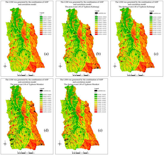 The LSM and related-event LM categories (a) The LSM was generated by the combination of AHP and correlation model; (b) The LSM overlapped with the post-event LM of Typhoon Kalmaegi; (c) The LSM overlapped with the during-event LM of Typhoon Kalmaegi; (d) The LSM overlapped with the post-event LM of Typhoon Morakot; and (e) The LSM overlapped with the during-event LM of Typhoon Morakot.