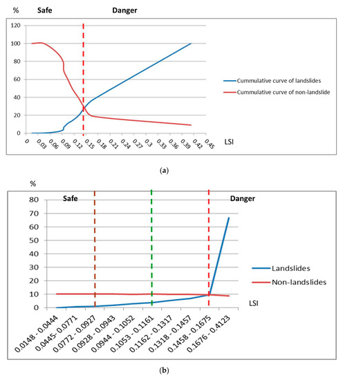 How to define thresholds of LSI. (a) Cumulative curves of landslides and non-landslides; (b) Distribution percentage curves of landslides and non-landslides.