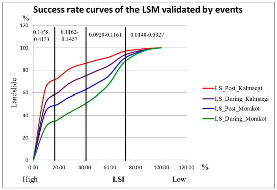 Besides, success rate curves have been used in many studies to assess the validity of predictions produced under different scenarios, and they have also been applied in some works that obtained LSI maps using different factors [39,40,41,42]. The “success rate curve” is a method which has been used to measure the accurate proportion of prediction by plotting cumulative percentages of high LSI risk and real landslide during typhoon. Therein, the data of overlapping LSI values and actual landslides were analyzed, and based on the resulting statistics, the cumulative percentages of LSI and landslide were calculated. These results were then plotted on the same graph, known as a “success rate curve”. By observing the distributions of the curves in the graph, it is possible to assess the accuracy of the related predictions.