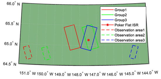 Position relationship of three ground tracks of PALSAR scenes and Poker Flat ISR. The red rectangle corresponds to the PALSAR scene of Group 1, while the green and the blue ones correspond to the measurement of Group 2 and Group 3, respectively. The position of Poker Flat ISR is shown as a red asterisk, while the observation area of each group is shown as a dashed rectangle in its corresponding color.
