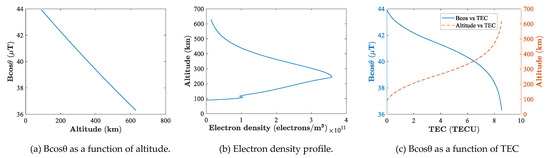 In Equation (7), is the maximum altitude to which the TEC is measured, and in this paper, it is the altitude of PALSAR. Integrating the right side of Equation (7) while recalling Equation (3), we can obtain