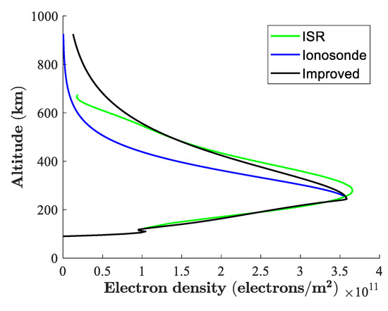 Figure 5 shows the result of the proposed method where “ISR” represents the ISR data after polynomial fitting. Note that we adopted the ISR data from all beams for polynomial fitting, rather than the vertical beam only, because the TEC deviations between “Poker Flat ISR” and “Poker Flat ISR (average)” are small, and vertical data is too sparse to form a fine polynomial fitting. In Figure 5, “Ionosonde” stands for the original data obtained from DIDB, and “Improved” is our result with the topside profile calculated from the known TECTop. It is clear that the bottomside profile of ionosonde matches well with that of ISR, while the two topside parts are divergent. The reason for this was discussed previously, i.e., that no topside information is considered in the original method. After modifying the topside profile with the known TEC, we can easily see that the new topside profile is more consistent with that of ISR. The divergence between the ionosonde topside profile and the ISR topside profile reduced by 30.41 percent after the presented algorithm was adopted. Here, the divergence is defined as the average absolute difference between the ISR profile and the ionosonde profile, and the percentage of reduction was calculated from Equation (13). This result proves the validity of our method.