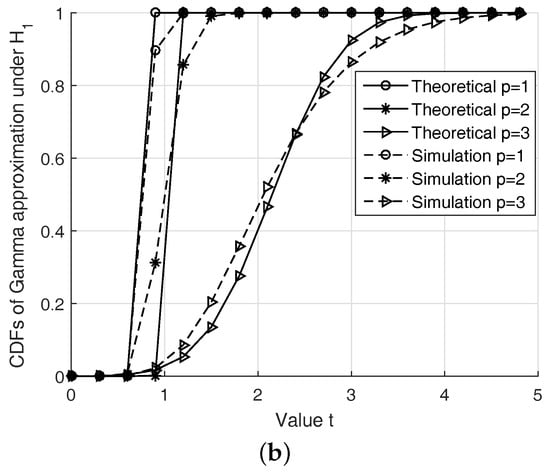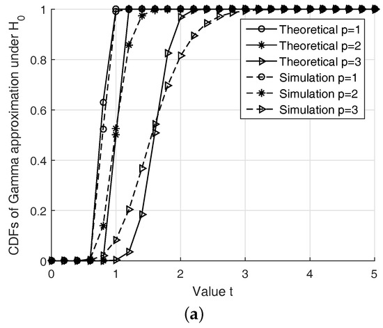 Following the above construction, in order to verify the accuracy of approximating the simulated PDFs (i.e., Gamma distribution) by the theoretical approximation (i.e., Q-function), Figure 2 illustrates those PDFs when dB, , and , thus, and . We observe that the Gamma approximation fits well in most cases considered. The accuracy of the approximation increases when p decreases. This approximation may be adequate for practical energy detectors since we can improve it by increasing the length D in the detection. Thus, we have to select appropriate values of length D and to guarantee high probability of detection, while keeping the Gaussian approximations to be valid.