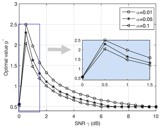 Figure 3. The optimum value of power order p versus . It shows the effect of on at several different SNR levels, which comes from solving procedure of (26). We generated an SNR vector of 21 equally-spaced points between 0 and 10. The -curve is aimed to choose the appropriate p value for the test statistic. - (iii)
