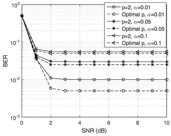 Figure 5 depicts the curves of BER versus SNR with several value of for the proposed detector. We set dB and . The BER approaches 0.5 at small and there exist little gaps between BER curves. We observe that the BER decreases as increases. However, the smaller offers higher data rate from the relationship