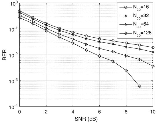 Figure 5. BER versus SNR with . As we predicted, the BER increases as decreases. Since N is defined to be proportional to , while should be greater than the channel delay spread L to eliminating the interference, there exists tradeoffs between the CP length and the subcarrier spacing as well as the CP length and the tag rate. - (iv)