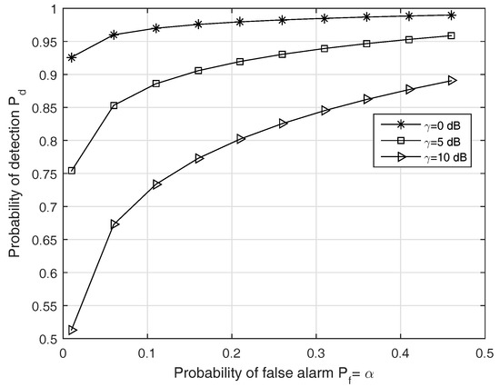 In order to assess the performance of the proposed detector, we plot the ROC curves in Figure 6, which shows the relationship between the probability of detection and the probability of false alarm for a given SNR . We confirm that the proposed approach provides better ROC values when is small, i.e., the performance gain becomes much larger in the lower SNR environment. As the SNR increases, the detection threshold must be set higher to obtain a good ROC.