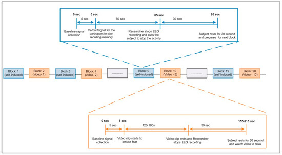 The complete flow of the whole experiment is elaborated in Figure 2. Participants performed one block of Session-I (self-induced), then one block for Session-II (video induced) in an alternate manner. The procedure is repeated until ten blocks of both sessions are completed. The following is the sequence for each block.