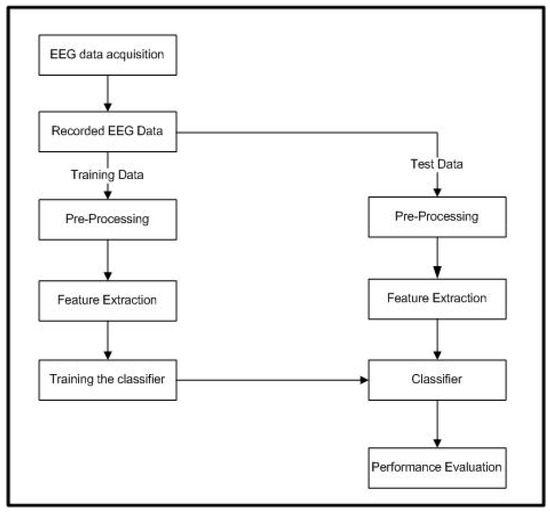 The proposed methodology to classify self versus audio/video clips induced emotions consists of four steps, that is, EEG data acquisition, preprocessing, feature extraction, and classification. First, electrical activity is recorded during the experiments from the human scalp using an EEG headset. The recorded EEG data are then preprocessed and band power features are extracted in different frequency bands in which the neurophysiological signals reside. The extracted features first train the classifier, and finally features from the test data are used by the classifier. The details of each block are described in the following subsections.