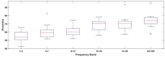 While performing the spectral analysis, we achieved the best mean classification performance of 76.97% in the gamma band of 50–100 Hz. To determine the computational efficiency, we compare our results with similar studies and research works. Zhang et al. [27] have worked on the DEAP database containing EEG data for four human emotional states (relaxation, sadness, fear, and joy). The authors applied three different methodologies for the selection of EEG electrodes. A support vector machine (SVM) was used as the classifier. As per the obtained results, the authors achieved accuracy of 59.13% with a complete set of 32 electrodes and identified beta and gamma bands as being the most relevant for emotion recognition. Kothe et al. [12] in their work presented analysis of twelve subjects who were engaged in emotional imagery for love, frustration, anger, and so on. In this work, the authors were able to achieve an average accuracy of 71.3% using a filter bank common spatial pattern algorithm. In our proposed method, we achieved a mean classification of 76% with the gamma band. Similarly, Tamd et al. [14] and Li and Lu [18] found the same observation.