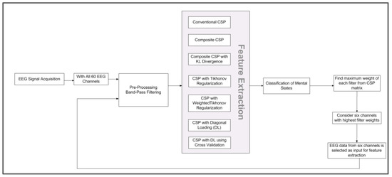 Here, the standard eigen value problem is obtained, and the filters in Equation (1) are termed as the eigen vectors of C2−1C1. The spatial filters correspond to the largest and lowest values of these eigen vectors. In the case of the CSP algorithm, the logarithm of EEG signal variance after projection onto the spatial filters constitutes the features extracted [37].