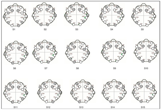 On the basis of the spatial filter weights criterion, combinations of eight electrodes are obtained. Figure 7 displays configurations with eight channels for each subject. From the figure, it is obvious that the electrodes at frontal position AF3 and F4 are found in most of the subjects, indicating that there are some channels that have a higher frequency of appearance across subjects. This is in accordance with the already obtained results as mentioned in the works of [53,54,55]. It can be concluded that the frontal brain region is more relevant in the case of self-induced human emotions. The comparisons indicate that some brain regions are more useful for the discrimination between self- versus videos-induced fear state. Here, it is also interesting to observe that the channel configurations for almost all subjects are different even though the experimental protocol, feature extraction, and frequency band selection are same while performing the method for selection of channels. Our experimental results show that channel selection is predominantly subject-specific, as we observed in other research studies for EEG channel reduction [56,57].