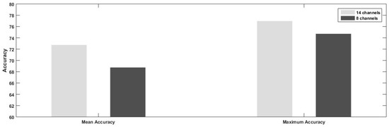In Figure 8, the results for maximum and mean accuracies achieved from a total of 14 and 8 channels are compared. It is observed that classification performance decreases with the reduced number of channels, in contrast to results that we obtained in our previous work, in which channel reduction using spatial filter weights is done for motor imagery data recorded with a total of 60 electrodes. In our previous work, we obtained better classification recognition by reducing the electrodes from 60 to 6 based on spatial filter coefficient values [50].