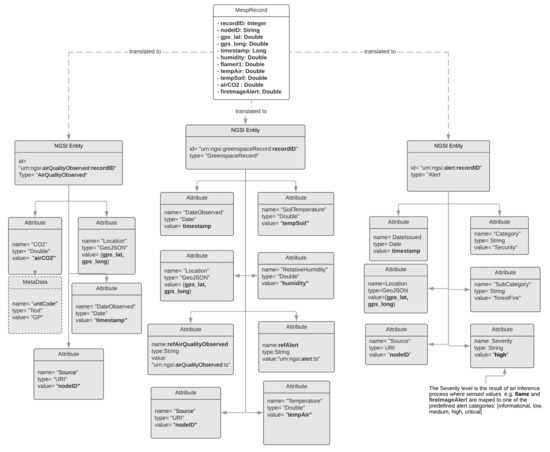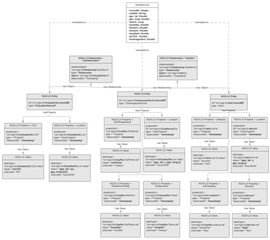 The IoT2Edge-Agent has been deployed on MESP while the “Connector” is retrieving the respective measurements and forwards them to the “Data Translator”. The “Data Translator” logic on mapping MESP measurements to NGSI information entities is depicted through the data object diagram in Figure 7. In a similar manner, the same process but targeting the NGSI-LD information model is illustrated in Figure 8. In order to make easier the tracking of information the NGSI and NGSI-LD attributes derived from MESP-Record are illustrated with bold fonts. The approach that is followed for the translation aims to achieve 0% information loss during the translation so all MESP data types are mapped to an NGSI data object. A first obvious outcome from this process is the increase of the overall data volume. According to the FIWARE-GSMA vocabularies the CO2, Air Humidity, Air and Soil Temperature information elements can’t be modelled under the same NGSI Entity. In order to be consistent with the already defined FIWARE models the respective MESP sensed data need to be modelled as Attributes of the Entities of type “AirQualityObserved” and “GreenSpaceRecord”. In addition, the raw measurement from the flame detection sensor can’t be modelled with the existing NGSI Attributes hence the Attributes of the Alert Entity are utilised. Toward this scope an inference process is necessary in order the raw flame sensor measurement to be mapped to a higher concept modelled as Alert [63] which is associated with the following classes:, informational, low, medium, high, critical. More details on the inference algorithms are presented in Section 5.3.