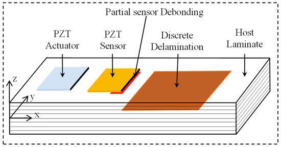 Smart composite laminates are obtained by integrating smart materials (PZTs, shape memory alloys, fiber optics) with laminated composites in the form of surface bonded or embedded sensors and actuators. Smart composite laminates synergistically integrate the preferential properties of the host laminates (e.g., high specific strength, high specific stiffness, fatigue resistance, design flexibility) and the smart sensing and actuation capabilities of the smart materials. Some contemporary engineering applications of the smart composite laminates are in the aerospace, automotive, marine, and robotics fields [,,], among others Although smart composite laminates offer the advantages of self-sensing [], diagnostics [], vibration and noise suppression [,], shape control [], and can respond to changing environments [], they are also susceptible to various types of damage in the orthotropic host laminates as well as partial debonding failure of the smart elements []. Some frequent damages in laminated composites are delamination [,], matrix crack [,], fiber breakage [], among others. Delamination is one of the most feared and major modes of failure, because of its serious implications for the integrity of the structure []. Also, the high free-edge stress between the host laminate and smart elements ultimately results in the partial debonding failure of the sensor/actuator from the host structure [].