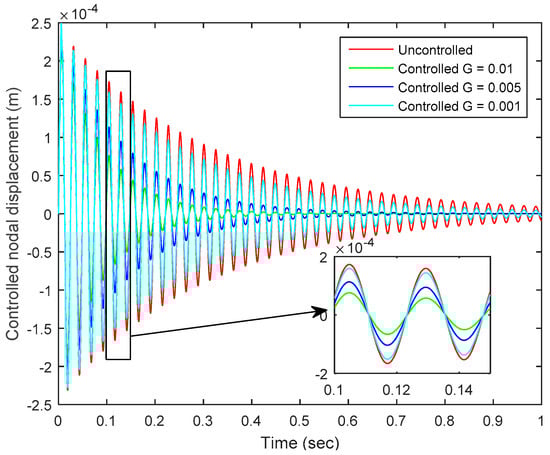 The dynamic response of the smart plate was obtained by applying an impulse load of 1 N at the tip-center of the plate, and CGVF control strategy was implemented to suppress the vibration of the smart plate. Figure 3 shows the controlled and uncontrolled nodal displacements of the smart plate as measured at tip-center of the plate, which is well-controlled; increasing the value of the control gain (G) increases the control authority.