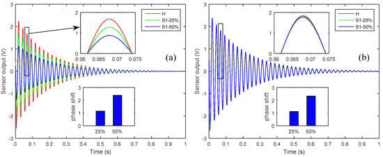 The effect of partial debonding failure of sensor 1 on the controlled response: (a) sensor 1 output, when sensor 1 is partially debonded; (b) sensor 2 output, when sensor 1 is partially debonded.
