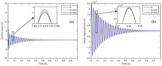 The effect of 25% and 50% partial debonding of sensor 1 on: (a) Control input signal; (b) Nodal displacement at the tip of the plate.