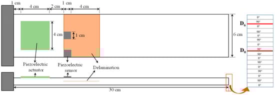 To study the effects of structural delamination on the active vibration control of a smart plate, a structural delamination of 5 cm is seeded at the mid-plane interface (D0) and at the 6th interface from the mid-plane (D6) along the thickness of the smart plate, as shown in Figure 6.