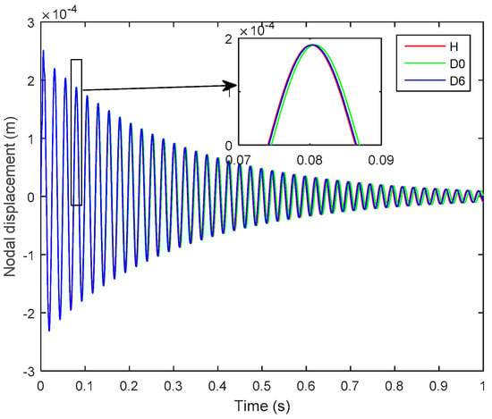 It is worth noting that the presence of delamination at the mid-plane interface of the laminated plate is more severe and is more easily detectable than is a delamination of the same size that occurs farther away from the mid-plane, i.e., near the free surface []. Hence, in Figure 6, the D0 is more pronounced and more easily detected than is the D6. An impulse load of 1 N was applied at the tip of the plate for 0.01 s, and Figure 7 and Figure 8, respectively show the open-loop nodal displacement at the tip of the plate and the closed-loop response signals of the two sensors for the healthy and delaminated plates.