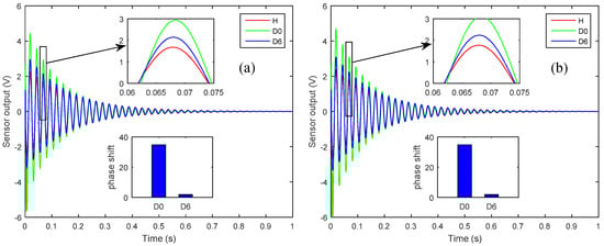 Herein, one can see from Figure 7 and Figure 8 that, although the presence of structural delamination has not altered the magnitude of the open-loop nodal displacement, the closed-loop sensor’s outputs clearly capture the effect of delamination in the laminated plate. Also, the closed-loop response for the healthy case is smaller in amplitude than is that for the delaminated cases, because the presence of structural delamination causes a loss of structural stiffness in the laminated plate []. Furthermore, the effect of more severe delamination (D0) is more pronounced than is that from the relatively less severe case of delamination (D6). The subplots in Figure 8 show that a phase shift relative to the undelaminated smart plate could be used to assess the level of severity of the delamination damage in the structure.