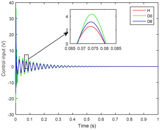 Figure 9 shows the effect of structural delamination on the control input signal applied to the actuator to attenuate vibration. Herein, one can see that the magnitude of the control input signal is the smallest for the healthy case (H), whereas higher control input voltages are applied to control the delaminated structures. Furthermore, the more severe case of delaminations (D0) requires a higher-magnitude control input than does the less severe case of delamination (D6).