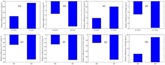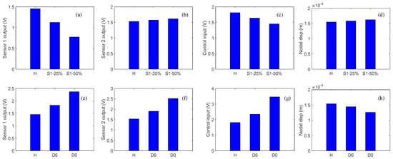 Comparison of the relative differences of sensor debonding and structural delamination as compared with the healthy state: (a) Sensor 1 output at t = 0.0925 s, sensor 1 debonding; (b) Sensor 2 output at t = 0.0925 s, sensor 1 debonding; (c) Control input at t = 0.072 s, sensor 1 debonding; (d) Controlled nodal displacement at t = 0.0805 s, sensor 1 debonding; (e) Sensor 1 output at t = 0.0925 s, structural delamination; (f) Sensor 2 output at t = 0.0925 s, structural delamination; (g) Control input at t = 0.072 s, structural delamination; (h) Controlled nodal displacement at t = 0.0805 s, structural delamination.
