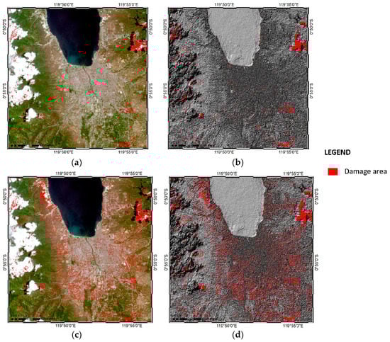 Post-earthquake damage maps of Palu, Indonesia, generated using the decorrelation method from the (a) ANN classification results in true color view, (b) ANN classification results in hillshade view, (c) SVM classification results in true color view, and (d) SVM classification results in hillshade view.